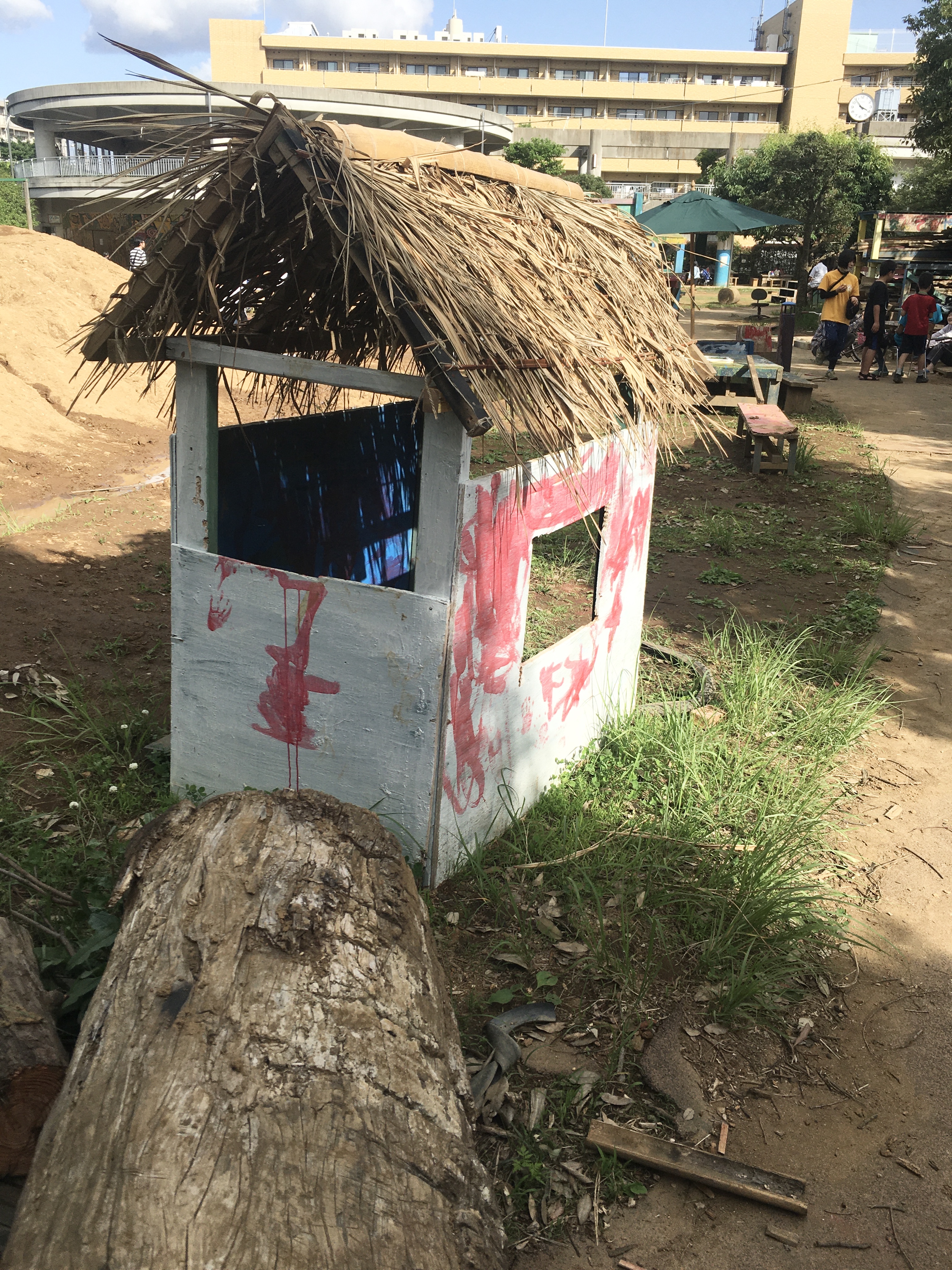 自作の家や小屋など、入って遊んでも良いし、屋根によじ登って飛び降りても楽しめます。
